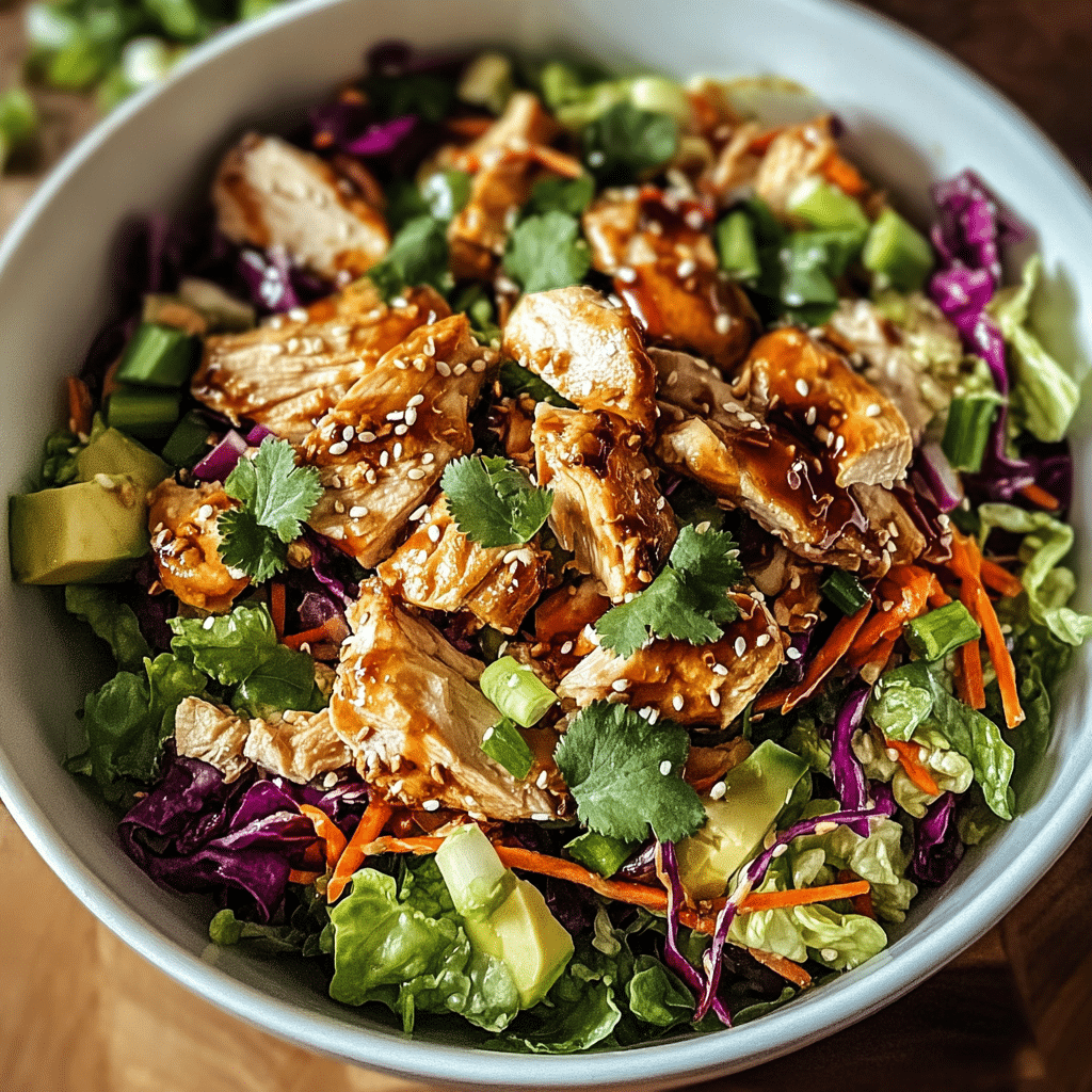 A fresh and vibrant Asian-inspired salad featuring tender grilled chicken, crisp vegetables, and a savory sesame dressing that delivers the perfect balance of flavors and textures.