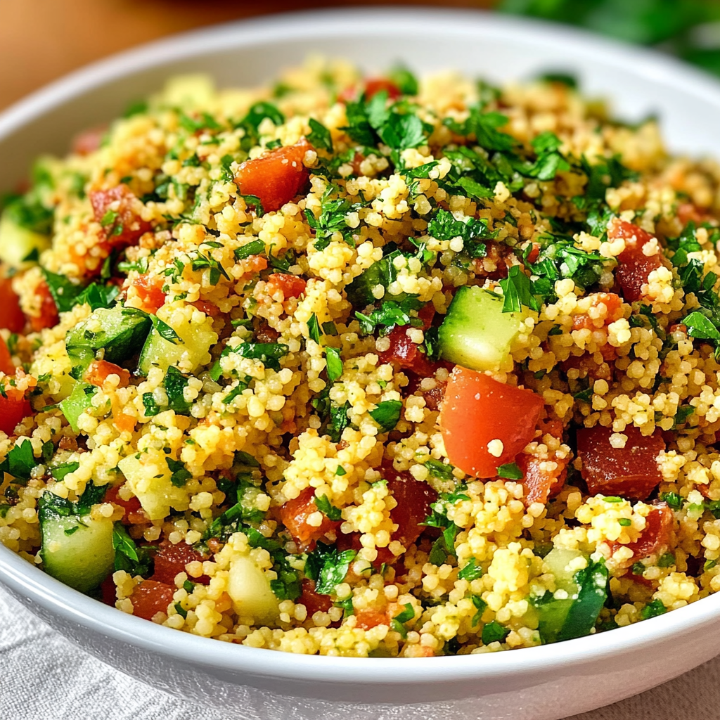 Keywords: Mediterranean salad recipe, tabbouleh with couscous, fresh herb salad, Middle Eastern couscous dish, quick summer salad, vegan tabbouleh recipe, healthy grain salad, parsley mint salad