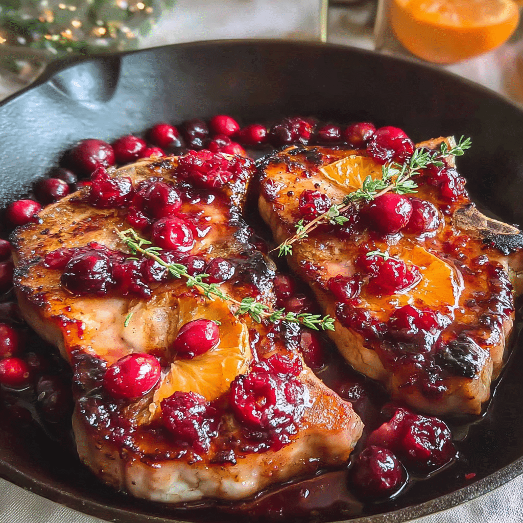 Tender, juicy pork chops seared to perfection and glazed with a sweet and tangy cranberry sauce. This elegant main dish combines savory herbs with the bright flavors of cranberries for a restaurant-quality meal at home.