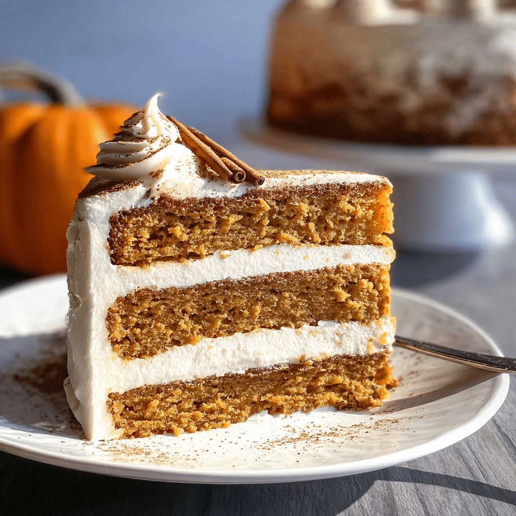 A delicious and moist layered pumpkin spice cake perfect for fall celebrations, featuring warm spices and creamy frosting between tender cake layers.
