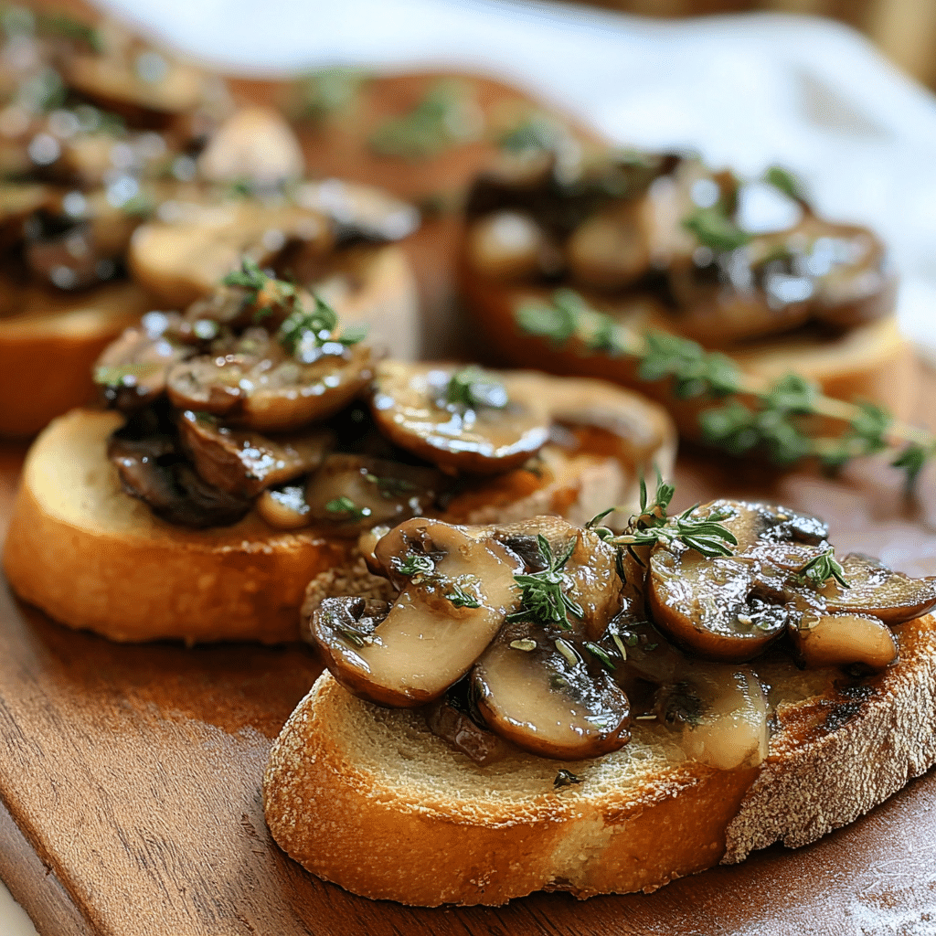 A delicious and easy recipe for mushroom thyme bruschetta featuring sautéed mushrooms with fresh thyme on crispy toasted baguette slices, perfect as an appetizer or light meal.