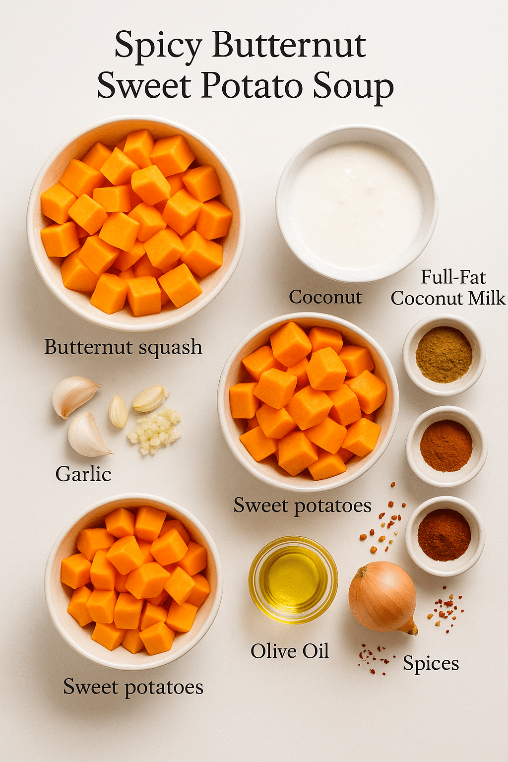 Gathering quality ingredients makes all the difference in this recipe. Fresh butternut squash and sweet potatoes are essential, while the spice blend creates the signature warming heat. Most ingredients are pantry staples, making this an accessible recipe for home cooks.