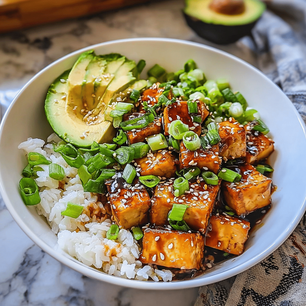 A delicious and healthy Asian-inspired bowl featuring crispy tofu glazed in homemade teriyaki sauce, served with fresh vegetables over rice or quinoa.