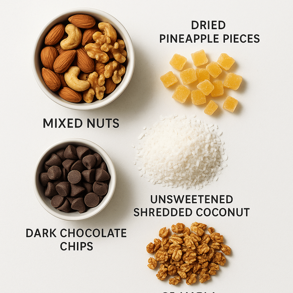 | Step 2: Combine | Add mixed nuts, dried pineapple, shredded coconut, dark chocolate chips, and granola to the bowl |