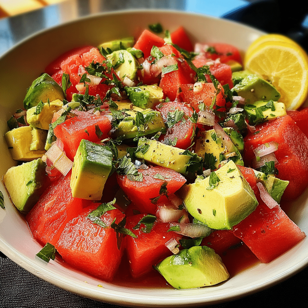 A refreshing and healthy watermelon avocado salad that combines sweet watermelon with creamy avocado, crisp cucumber, and fresh mint in a light citrus dressing. Perfect for summer gatherings and hot days.